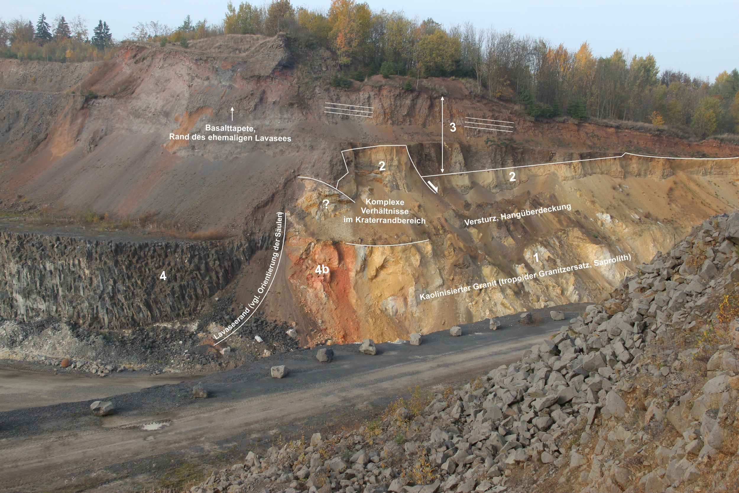 Ein Vulkan erzählt seine explosive Vergangenheit. Der durch den Abbau entstandene Anschnitt durch die Kraterrandzone zeigt die verschiedenen Eruptionsstadien des Hirschentanz-Vulkans bei Konnersreuth (Nordostbayern).