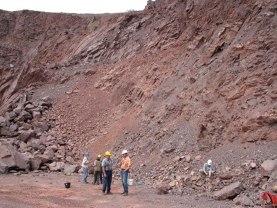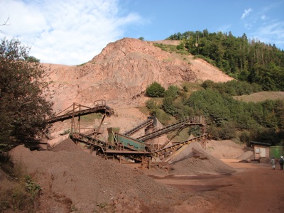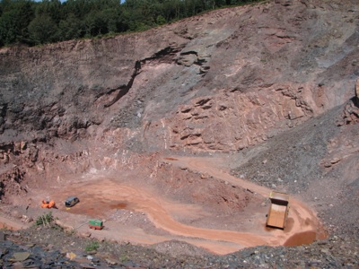 Der Steinbruch lag in der Morgensonne. Uns erwarteten Gesteine des unteren Emsiums, rot gefärbte Schiefer der Klerf-Formation.