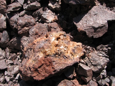 Gänge aus Kalkspat und Quarz durchziehen den Diabas. Auch hier fand sich Dolomit auf Kluftflächen, daneben Hämatit, kugeliger Calcit und vielleicht auch Kupfermineralien.