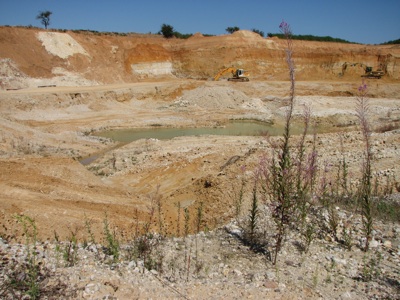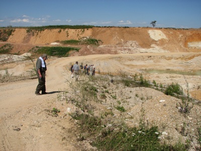 Nach kurzem Fußweg erreichten wir den Steinbruch. Fundmöglichkeiten bestanden sowohl für die Mineraliensammler als auch für die Fossiliensucher. In Tonschiefer-Linsen konnte man Pflanzenhäcksel finden. Zusammen mit vereinzelt auftretenden Brachiopoden in sandigeren Partien wurden damit marine aber landnahe Ablagerungsbedingungen angezeigt. An Mineralien konnten Dolomit oder Ankerit, Aragonit und Calcit in kugeligen Aggregaten sowie Baryt erkannt werden.