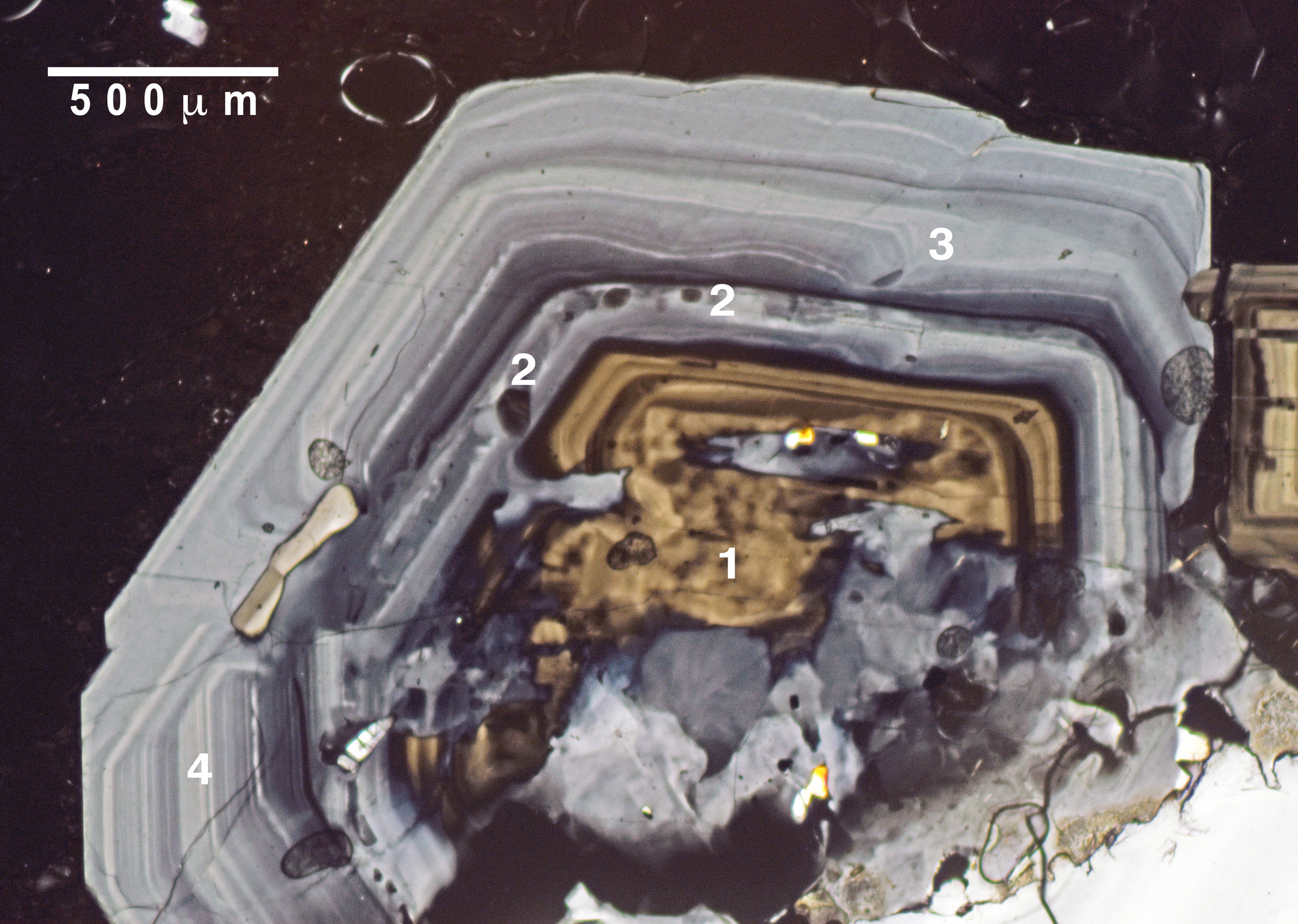 Plagioklas ist ein Misch-Mineral aus Albit (Ab) und Anorthit (An), dessen Zusammensetzung sich mit der des Magmas, dem Wassergehalt und der Temperatur ändert. Im polarisierten Foto zeigen unterschiedliche Farben/Grautöne unterschiedliche An Gehalte an. Dieser Einsprengling aus der dazitischen plinianischen Alpehué Tephra (ca. 3 ka, Vulkan Sollipulli, Chile) hat einen fleckigen Kern (1), der vermutlich als An~40% Xenokristall von einem weniger differenzierten Magma, in dem An>50% stabil war, aufgenommen, resorbiert und teilweise rekristallisiert wurde, sodass beide Zusammensetzungen in den fleckigen Zonen vorkommen. Um den Kern folgt eine Zone "konkordanter Schichtung", während der der Kristall mit wechselnden An-Gehalten wuchs. Darauf folgt eine Resorptionszone (2) mit unregelmäßigen Strukturen und zahlreichen Schmelz(Glas)-Einschlüssen (ovale dunkle Flecken). Die Resorption wurde vermutlich durch eindringendes mafisches Magma verursacht. In der äußeren, "fein geschichteten" Zone 4 wuchs der Kristall unter generell abnehmendem An-Gehalt (bis ~35% An am Rand), aber diese Abnahme verläuft im Zig-Zag, also nicht stetig, und ist auch von Diskordanzen (3) durch leichte Resorption unterbrochen, Hinweise auf andauernde Magmenmischung.
