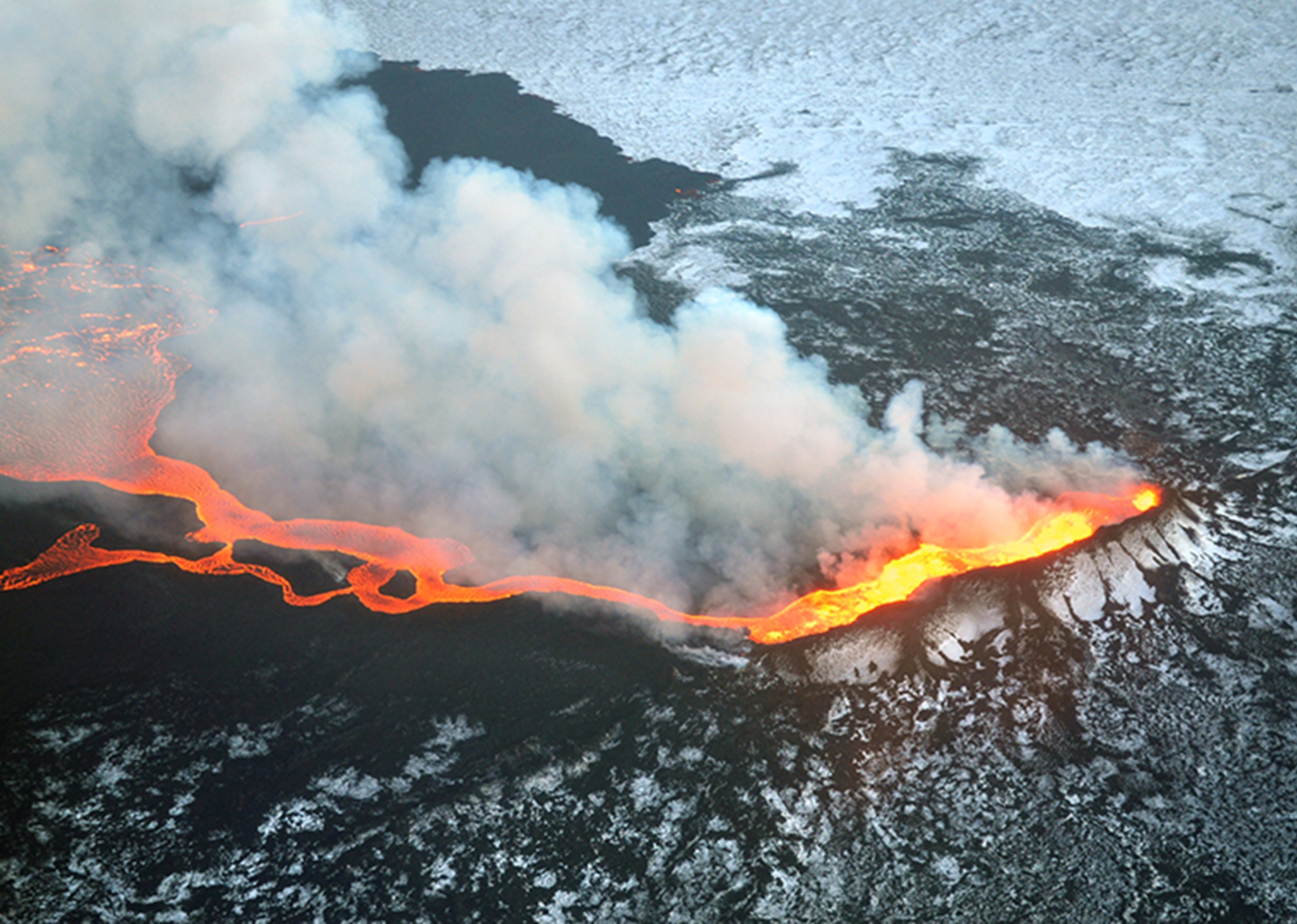 Ausbruchsspalte und Lavastrom von Holuhraun (Island). Im August 2014 begann am Vulkan Bárðarbunga unter dem Gletscher Vatnajökull, verursacht durch eine Magmaintrusion, die sich wenige Kilometer unter der Erdoberfläche ihren Weg über gut 40 km nach Norden zur eigentlichen Ausbruchsstelle bei Holuhraun bahnte. Der Ausbruch begann Ende August 2014 und dauerte knapp sechs Monate bis Mitte Februar 2015. Gut ein Kubikkilometer Lava ergoss sich in das unbewohnte Gebiet, die Fläche des Lavastroms erreichte eine Fläche vergleichbar mit der Halbinsel Manhattan.