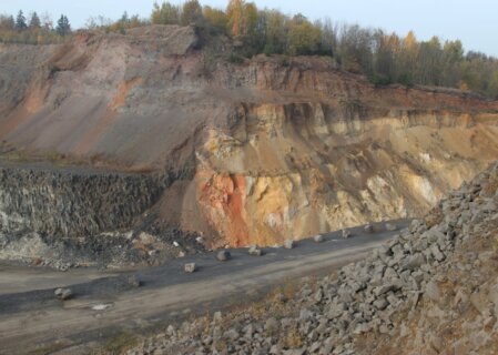 Ein Vulkan erzählt seine explosive Vergangenheit. Der durch den Abbau entstandene Anschnitt durch die Kraterrandzone zeigt die verschiedenen Eruptionsstadien des Hirschentanz-Vulkans bei Konnersreuth (Nordostbayern).