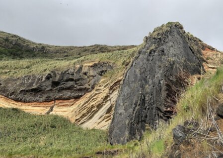 Basaltischer Gang Rocha do Cascalho an der Südküste São Miguels (Azoren), westlich der Ortschaft Relva. Der Gang streicht ENE-WSW und ist ca. 6 m breit und zeigt interessanten vertikalen Lagenbau, der auf eine texturelle Variabilität des geförderten Magmas schließen lässt. Der Gang durchschlägt trachytische, pyroklastische Ablagerungen des Vulkans Sete Cidades und hat diese im Kontakt verschweißt. Die basaltische Einheit links vom Gang ist ein basaltischer Lavastrom (älter als der Gang), der in die pyroklastischen Ablagerungen eingeschaltet ist.