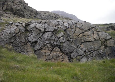 Besonders beeindruckend ist der fotografierte Aufschluss, welcher einen großen, dreieckigen Block aus Troktolith- und Peridotit-Gesteinen zeigt. Troktolith besteht hauptsächlich aus den Mineralen Plagioklas und Olivin während im Peridotit die Mantelphasen Olivin, Pyroxen und Plagioklas auskristallisierten. Dieser Block ist von gestörtem Troktolith umgeben, der sich offenbar wie eine Art Decke über den Block gelegt hat. Das Spannende daran: Die Gesteine zeigen, dass sich die „gleichen“ Materialien innerhalb der Magmakammer sowohl spröde (also brüchig) als auch duktil (verformbar) verhalten können. Geologen gehen davon aus, dass hier Gesteine vom Rand der Magmakammer in deren Tiefe „abgerutscht“ sind ganz ähnlich wie bei einer Lawine im Schnee. Solche Aufschlüsse liefern Vulkanologen wertvolle Erkenntnisse darüber, wie Magmakammern im Erdinneren funktionieren und helfen ihnen, besser zu verstehen, was unter aktiven Vulkanen passiert.
