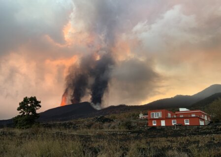 Ausbruch des Vulkans Tajogaite auf La Palma (Kanaren) im Oktober 2021, gesehen am frühen Morgen des 11. Oktober aus der Sperrzone im Dorf Las Manchas. Der wachsende Kegel (finale Höhe fast 190 m über vorheriger Topografie) entstand durch die gleichzeitige Förderung von Lava und Tephra. Lava trat quasi kontinuierlich am unteren (westlichen) Ende einer NW-SE-gerichteten Eruptionsspalte aus [hier nicht zu sehen]. Die explosive Aktivität fand in der Regel an mehreren Kratern auf dieser Spalte statt (im Bild zu sehen sind 3 aktive Vents) und zeigte häufig unterschiedliche Ausprägung, mit unterschiedlicher Größe und Temperatur der ausgeworfenen Tephra.